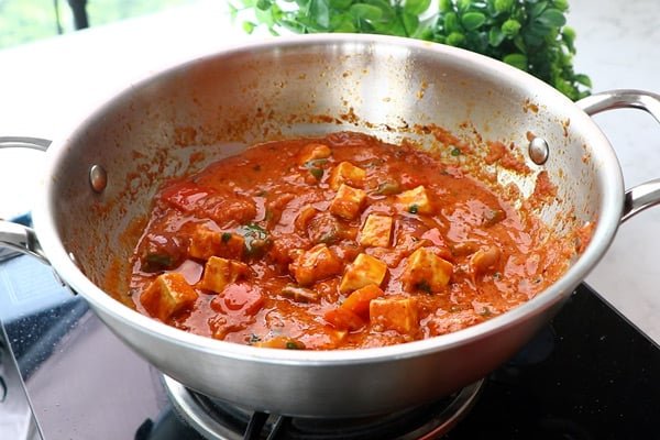 Now cover and cook on low flame for 5 minutes. This allows the paneer to absorb the flavors of the masala and remain soft.