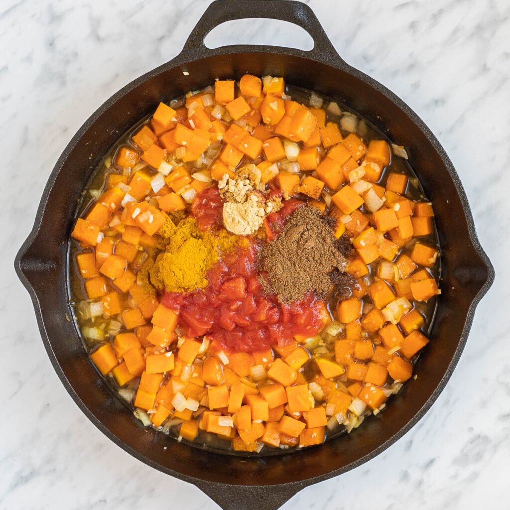 1. Add cubed butternut squash to the pan and stir to coat with the spices.