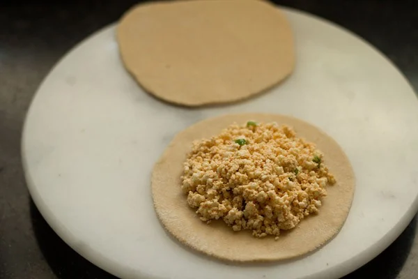 Place 2–3 tablespoons of the paneer filling in the center. Bring the edges together like a pouch, pinch to seal, and flatten gently.