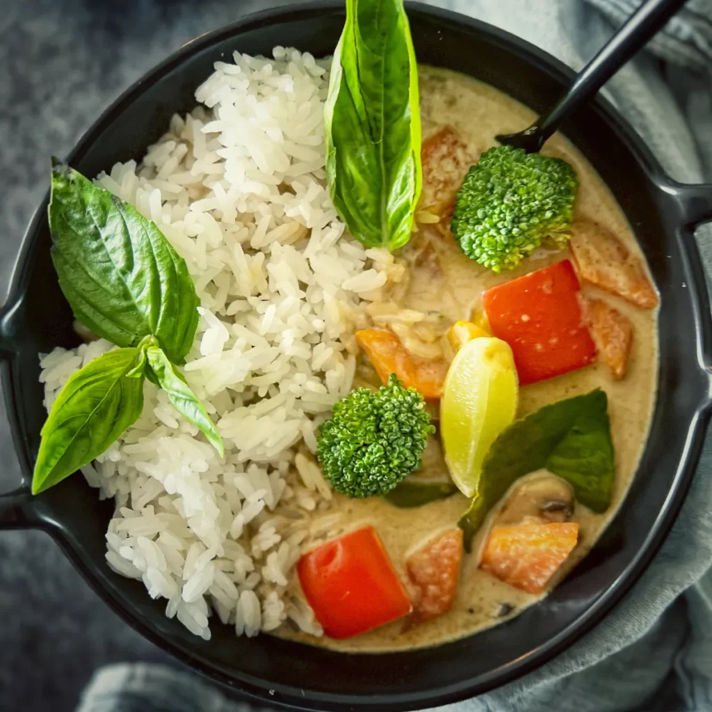 The green curry paste gives it depth, while coconut milk adds creaminess. Jasmine rice balances everything with its soft, fragrant flavor. It’s hearty enough to serve as a main course and versatile enough to pair with side dishes like spring rolls or roasted pumpkin wedges.